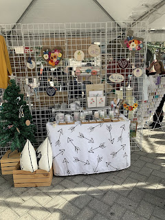 I wanted to post about the Christmas events we went to before the year goes further on and it doesn't make sense to post about Christmas related stuff. I found two free events in the local area of Plano, TX on Facebook events. The first event was advertised as a Christmas Village Market place in the Legacy West shopping area. We took a lyft to the event due to the traffic of driving there and parking. Once we arrived it was set up not like we imagined based on the pictures advertised on Facebook. I thought it would look like a Christmas village but it was just a bunch of pop up tents. It was extremely packed and a lot of people standing around so my husband and I couldn't exactly walk side by side. There were not a lot of shops as it advertised on Facebook as well. I was pretty disappointed with the advertising of the event and not Christmas themed at all. However, I did find a few cute shirts that I got one called Cat Lady, Wildflower, and Meowy Christmas. I also went to the Words for Season booth to get a temporary word tattoo so that was pretty fun for me. It was definitely a quick trip and event for us though since there wasn't much else to do. Check it out in the pictures below.